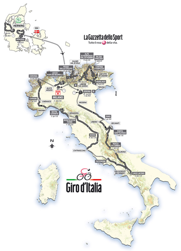 İtalya Bisiklet Turu 2012 parkuru geçen hafta sonu Milano'da açıklandı. 5 Mayıs'ta Danimarka'da başlayacak olan yarış 27 Mayıs'ta Milano'da yapılacak ITT ile son bulacak. Son yıllarda gittikçe artan zorluk düzeyi nedeniyle, sporcuların hoşnutsuzluğunu dikkate alan RCS, bu sene Giro için daha "medeni" bir parkur belirledi. İlk 2 gün Bjaerne Riis'in şehri Herning çevresinde yarışacak sporcular, Wouter Weylandt anısına koşulacak 3. Etap'tan sonra Danimarka'dan Verona'ya geçecekler. İlk 5 gün sivilce boyutunda üç yokuş dışında tırmanış yok, yani Mark Cavendish, Romeo ve Jülyet'in kentine iki zafer kazanmış bir Danimarka Prensi gibi gelebilir (sabah sabah Şekspir'i de kondurduk yazıya).
